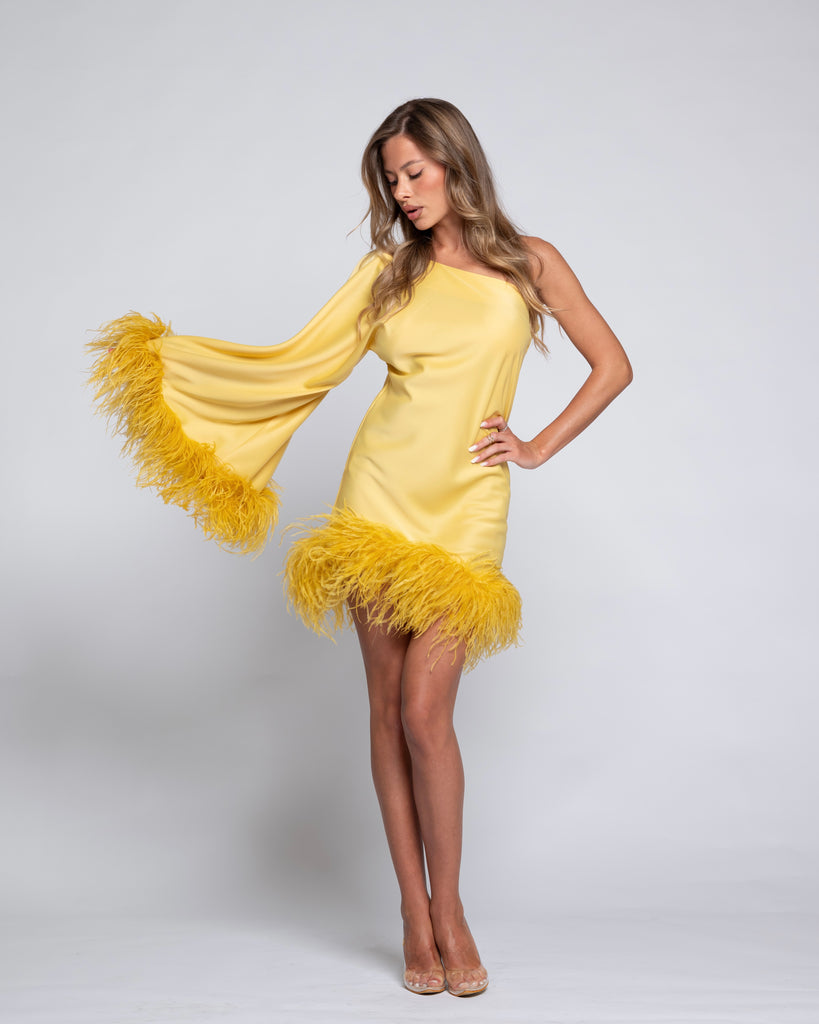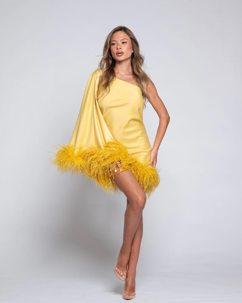 Abito corto monospalla, caratterizzato da vestibilità morbida e piume.