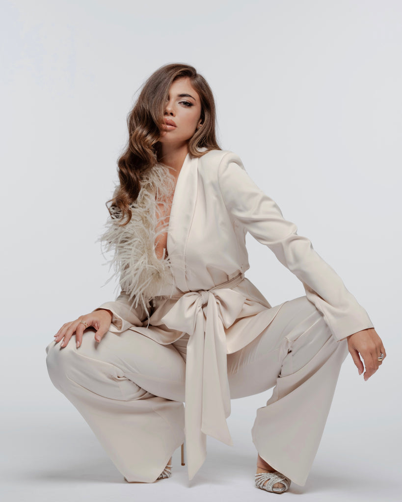 Pantalone vita alta morbido, gamba larga. Chiusura laterale con cerniera invisibile. La modella è alta 1,68 ed indossa la taglia S.