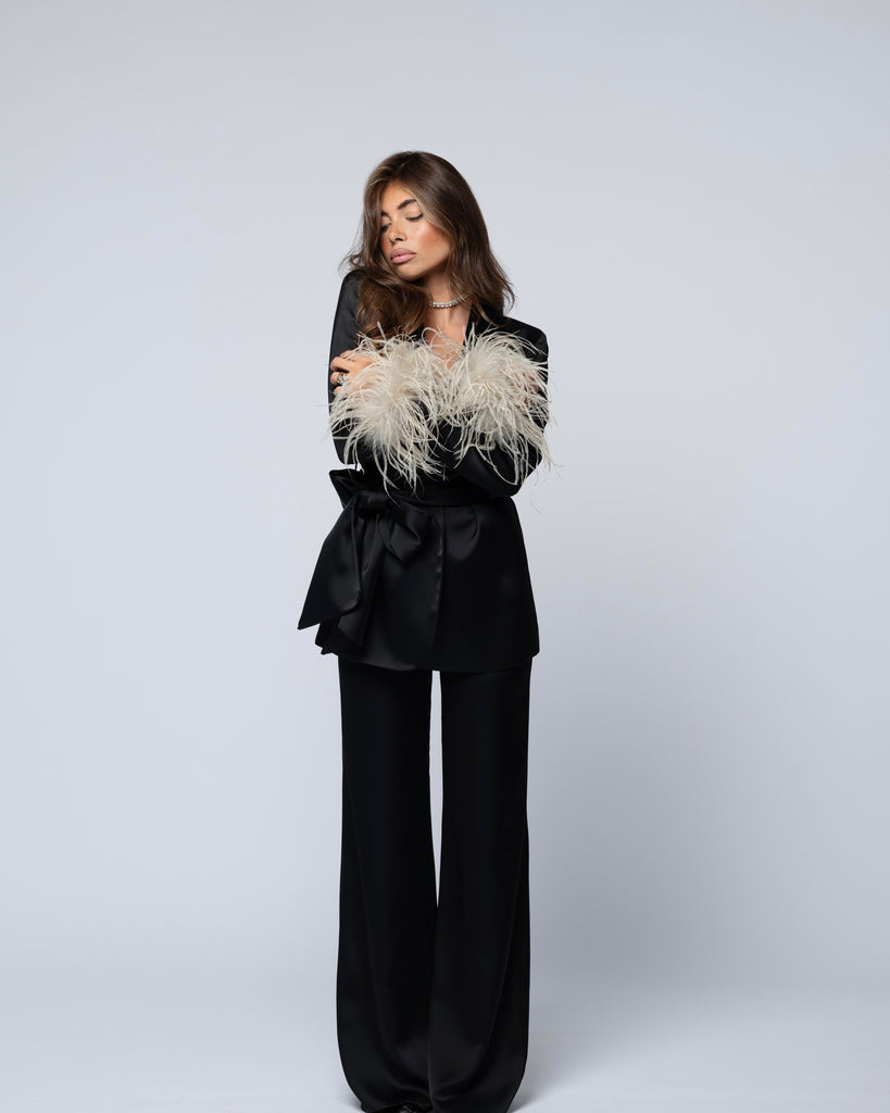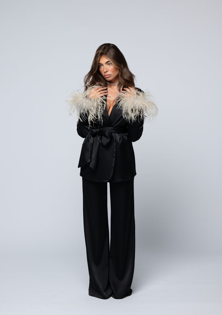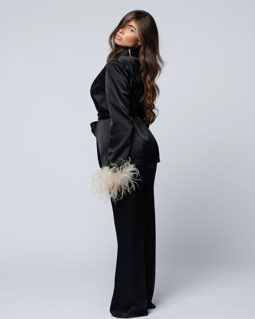 Blazer con cintura in vita e vestibilità regolare, maniche lunghe, interamente foderato con spalline. Dettaglio piume sui polsini.