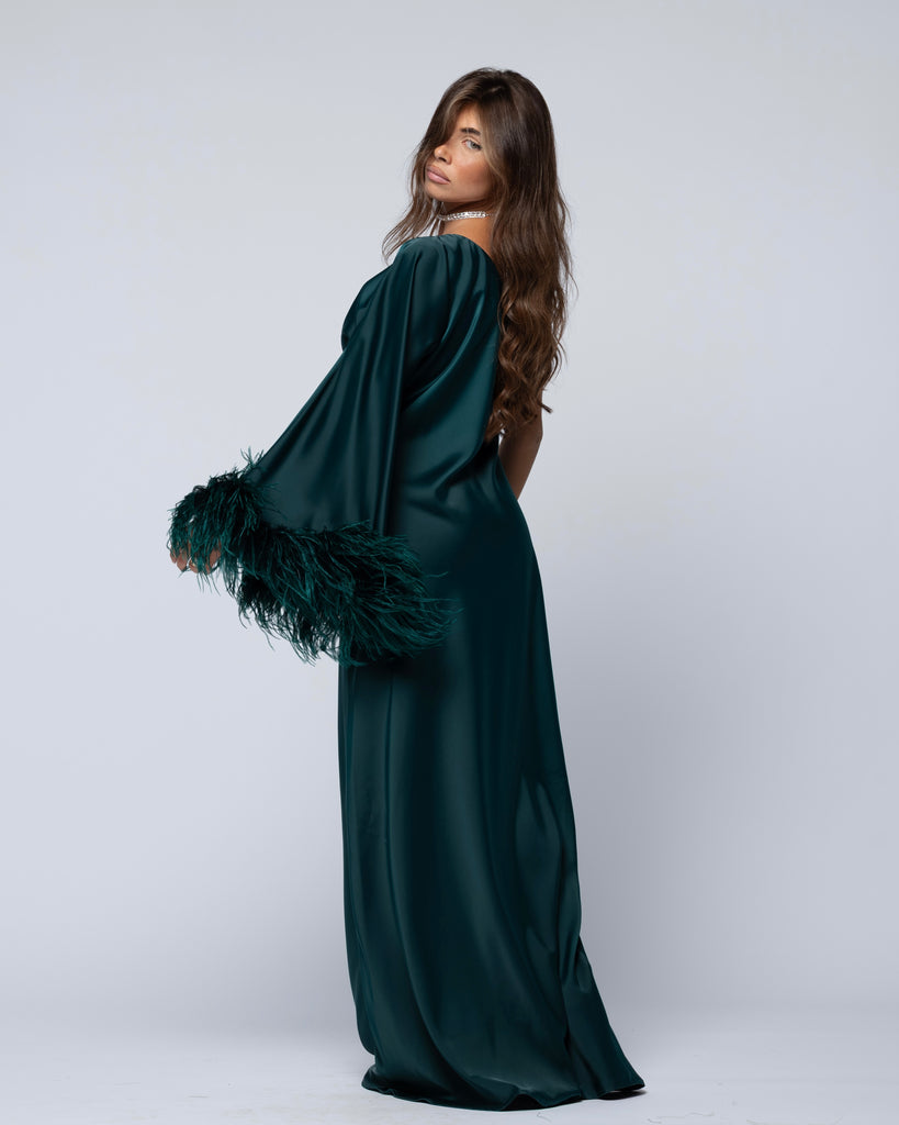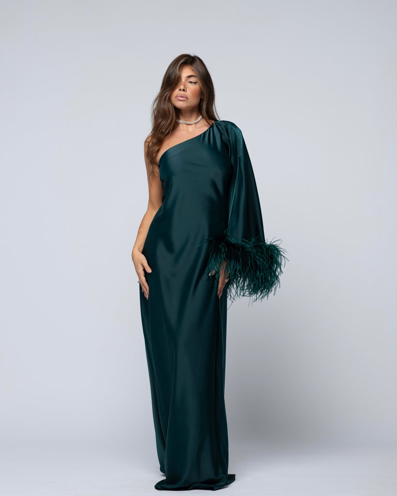 Abito lungo monospalla, caratterizzato da vestibilità morbida e piume.