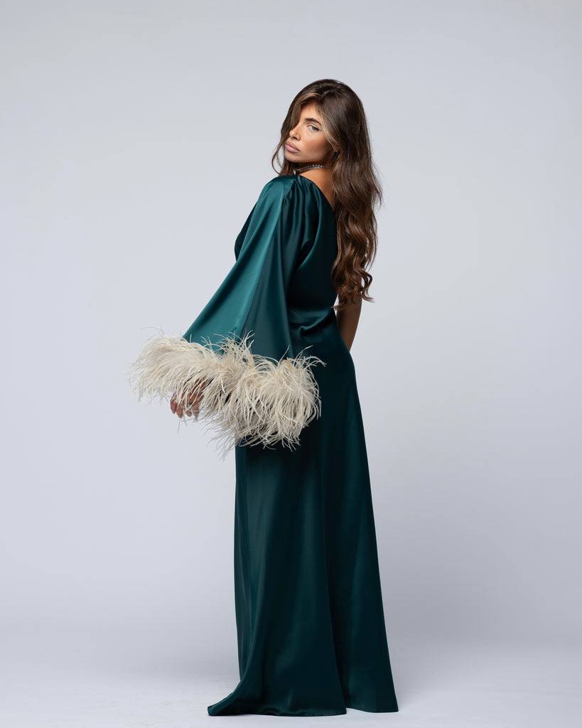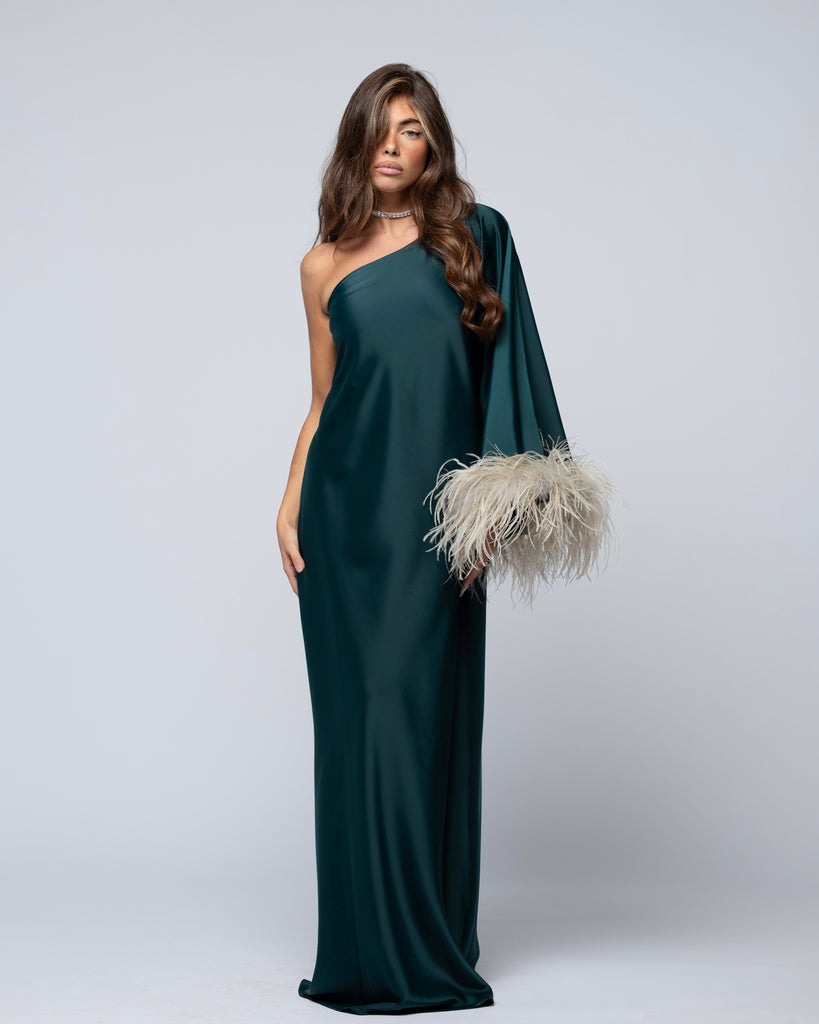 Abito lungo monospalla, caratterizzato da vestibilità morbida e piume.