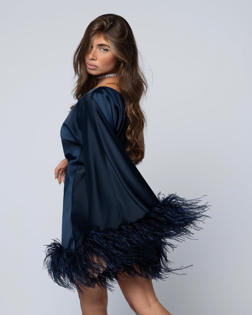 Abito corto monospalla, caratterizzato da vestibilità morbida e piume.