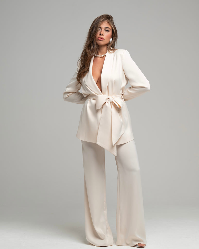 Pantalone vita alta morbido, gamba larga. Chiusura laterale con cerniera invisibile. La modella è alta 1,68 ed indossa la taglia S.