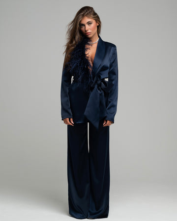 Pantalone vita alta morbido, gamba larga. Chiusura laterale con cerniera invisibile. La modella è alta 1,68 ed indossa la taglia S.