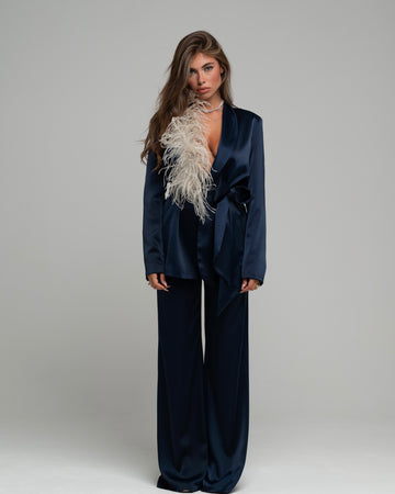 Pantalone vita alta morbido, gamba larga. Chiusura laterale con cerniera invisibile. La modella è alta 1,68 ed indossa la taglia S.