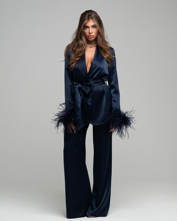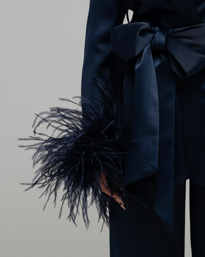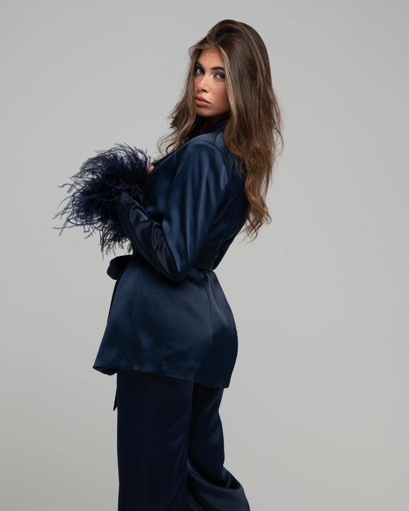 Blazer con cintura in vita e vestibilità regolare, maniche lunghe, interamente foderato con spalline. Dettaglio piume sui polsini.